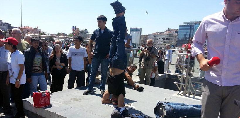 “Duran Adamlar” eyleminin devam ettiği Taksim Meydanı'nda bir kişi amuda kalkarak protestoya ...