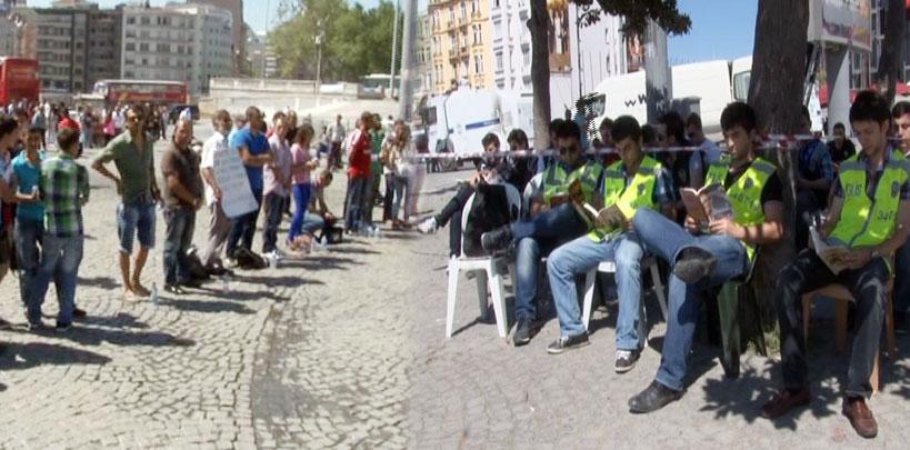 Taksim'de nöbet tutan polis ekipleri, İstanbul Emniyet Müdürlüğü Kütüphanesi tarafından ke...
