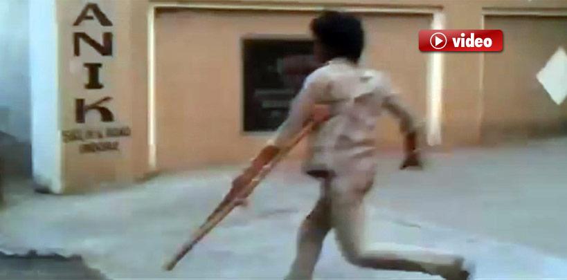 Hindistan'da koltuk değnekli dilencilik yapan 2 çocuk, yol kenarında duran bir adamın korkutmak ...